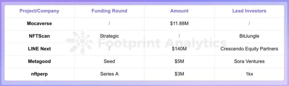 与 11 月份相比,本月 NFT 领域投融资活动较为活跃,共有五轮融资,累计筹集了 1.6 亿美元。