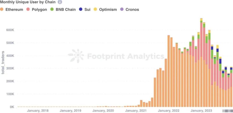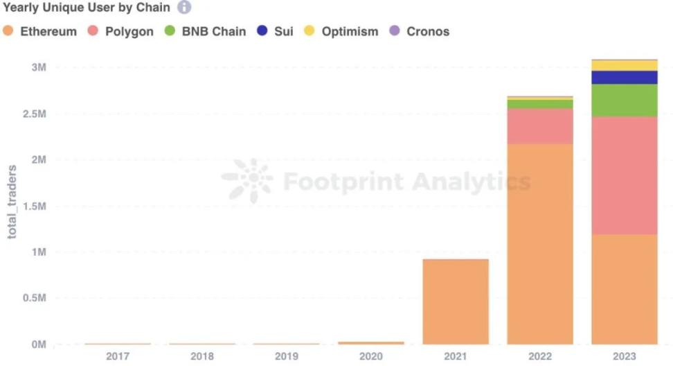 在 2023 年,Polygon 在独立用户数量方面领先,增长了惊人的 231.0%,达到了 128 万用户。然而,以太坊的用户数量却下降了 45.2%,降至 119 万用户,这反映了用户在不同公链之间的偏好发生了变化。BNB Chain 的用户基础扩大到了 35 万,较 2022 年增长了 280.7%。