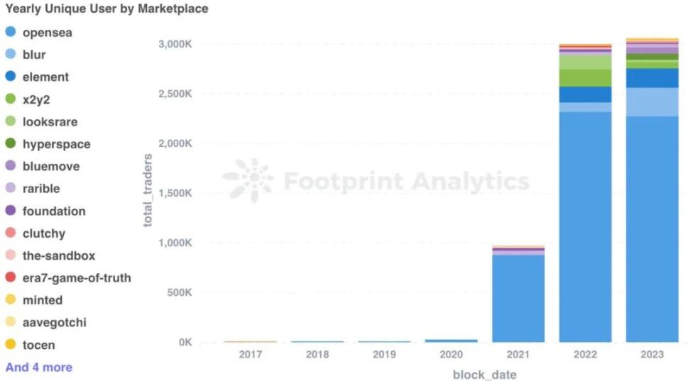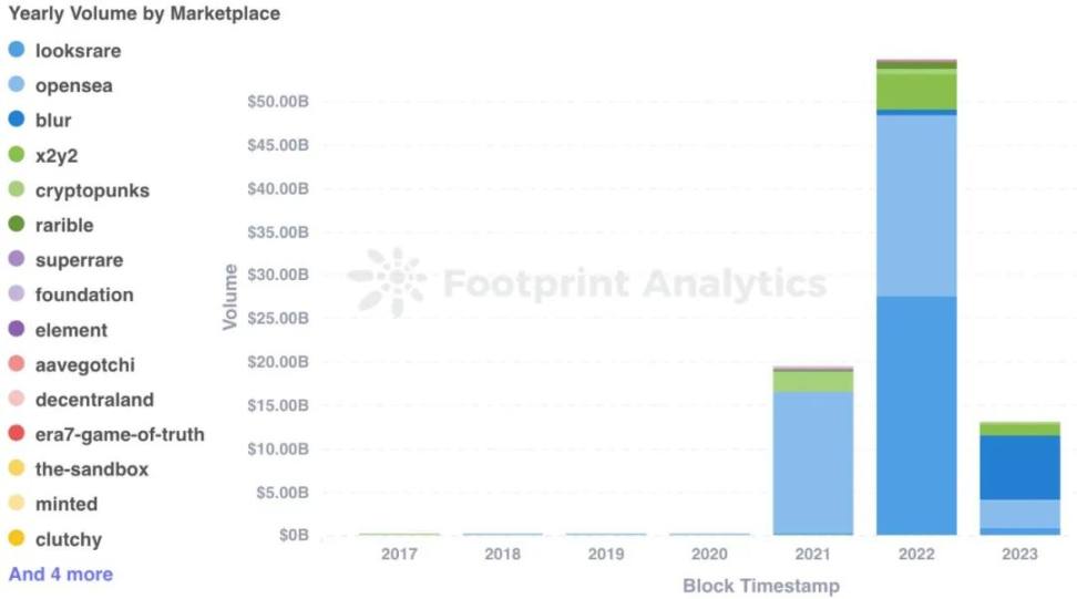 在 2023 年,NFT 交易市场的年度交易量表现与前一年相比出现了显著的变化。Blur 实现了惊人的年度交易量,达到了 72.6 亿美元,远超 2022 年的 6.5 亿美元。尽管 OpenSea 的交易量从 209.1 亿美元下降到了 33.1 亿美元,但它仍然在市场中具有一定的影响力。