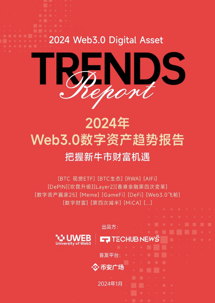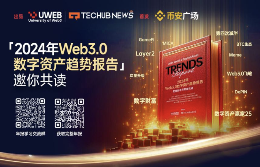 币安广场首发,Uweb&Techub News 出品的这份《2024 年 Web3.0 数字资产趋势报告》不仅是一份报告的陈述,它是对创新的献礼,是向每一位有勇气在 Web3.0 时代乘风破浪者的致敬。在这个波澜壮阔的数字资产市场中,我们不满足于观望,而是选择主导。让我们一同寻找北极星 。