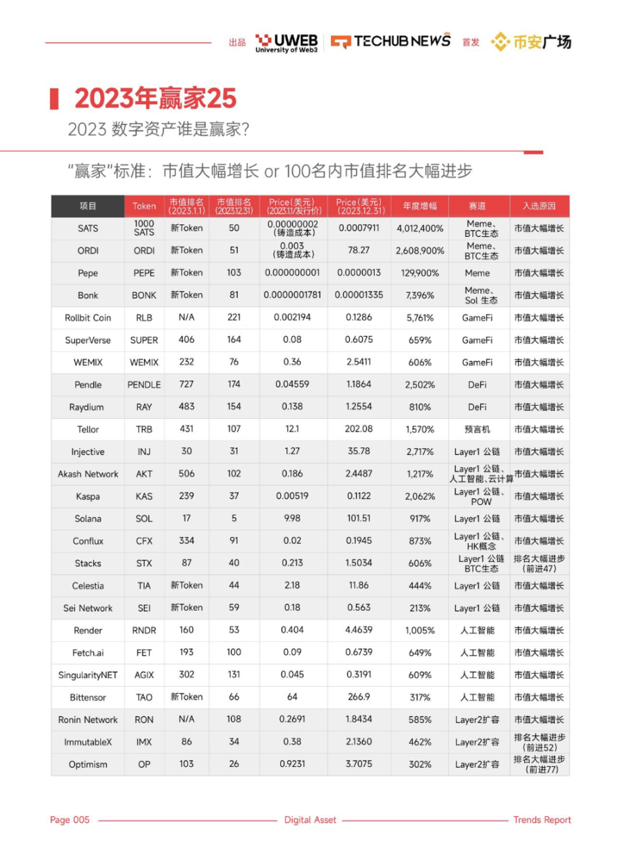 「2023 数字资产赢家 25」指数的诞生反映了数字资产市场的多样性和活力。从 Meme 到 DeFi,从 GameFi 到 Layer1 公链,从 Layer2 扩容到人工智能,再到预言机、BTC 生态和 Solana 生态,这一指数涵盖了各个领域的代表性项目。这不仅突显了 Web3.0 生态的广度,还展示了数字资产市场在不同方向上的创新性。 在 Web3.0 时代,数字资产市场将持续蓬勃发展,为全球的投资者和创业者提供前所未有的机会。然而,成功并不是易事,需要持续学习、深入研究和冷静的思维。通过更深入地了解市场,抓住机会,我们可以更好地参与这个充满活力的数字资产市场,并为未来的创新趋势做好准备。愿 2024 年对数字资产市场和所有参与者都能带来更多的成功和增长。
