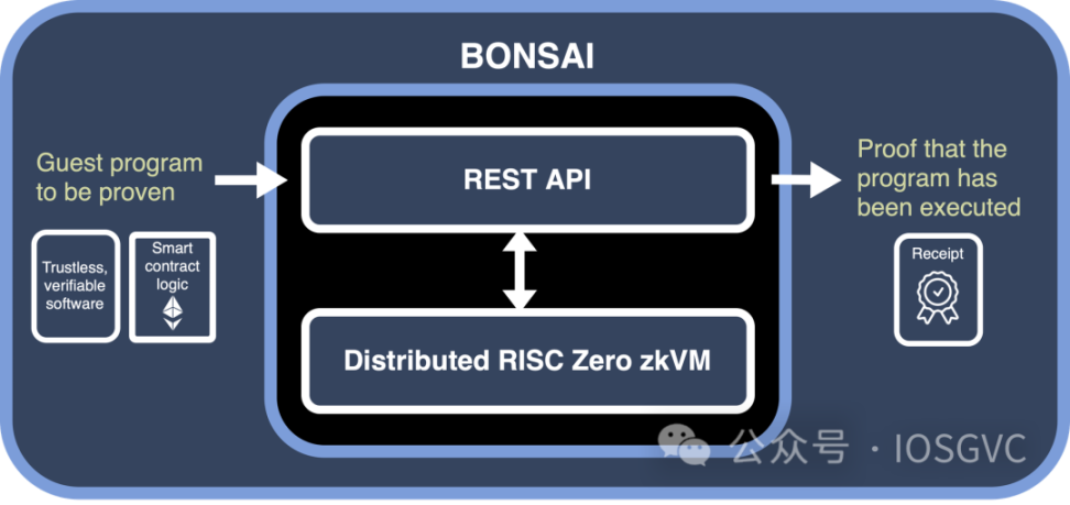 Risc Zero 利用它们的 zkVM 启动了 Bonsai。借助 zkVM 的力量,用户可以让 Bonsai 生成各种声明。例如,基于 Bonsai 和 Risc0 VM,Zeth 为以太坊区块生成证明。