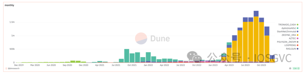 有许多令人感兴趣的项目依赖于 zk ,如 Starkware 、 zkSync 、 Scroll 、 Mina 、 Risc0 , =nil;Foundation , EZKL , Giza , Polygon 和 Manta 。这些项目每天稳定而持续地生成 zk proof 。目前最流行的 zk 使用案例是 zkRU 用于解决以太坊的可扩展性问题。在过去的一个月中,zk 验证在以太坊 / 以太坊 L2s 上花费了数百万美元。