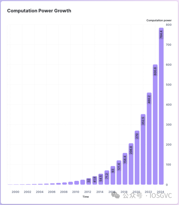 下图根据库默伊定律描绘了基于年份增长的计算能力图表。2000 年之后每十年芯片效率提高 10 倍。如果我们以 2000 年为基准对比计算能力,在 2025 年将达到 784 倍。这也表明当前 ZK 计算与 2000 年相比仍然不在一个数量级上。