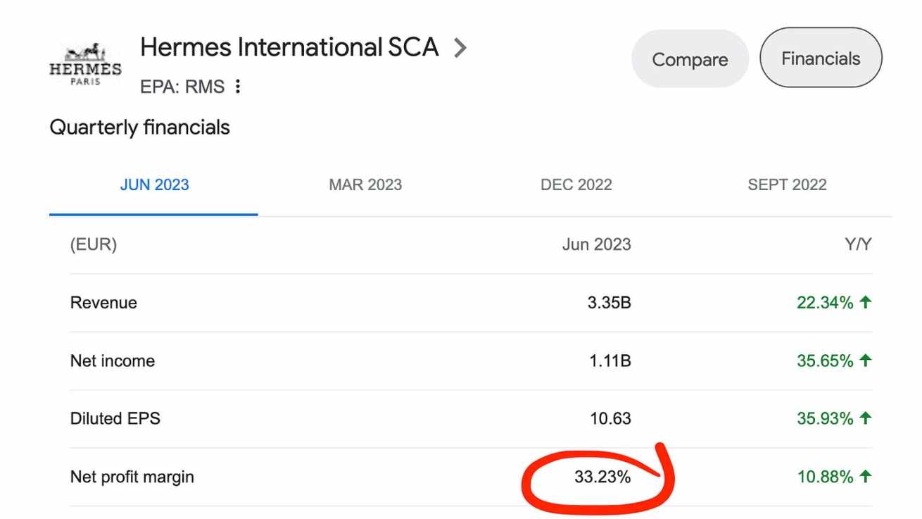 以赫尔墨斯为例。截至 2023 年 6 月,赫尔墨斯整个公司的净利润率高达 33%,与 FAANG 中的明星公司 Meta 相媲美,甚至是 Netflix 的 1.5 倍。这展示了接近软件行业的盈利能力,远超一般消费品的利润率。相比之下,耐克的净利润率约为 11%。
