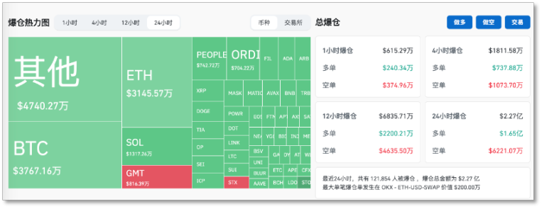 根据 Coinglass 数据,北京时间 1 月 9 日凌晨,整个市场期货合约 24 小时爆仓总额达到 2.27 亿,BTC 市场爆仓总额为 3767.16 万美元,ETH 市场为 3145.57 万美元,而其他山寨币市场的爆仓总额更可怖,为 4740.22 万美元。