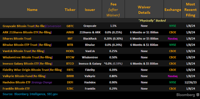 在值得注意的进展中,Bitwise 提供的长期费用最低,为 0.24%,其次是 VanEck,为 0.25%。此外,有三只 ETF 获得了为期六个月的费用豁免。