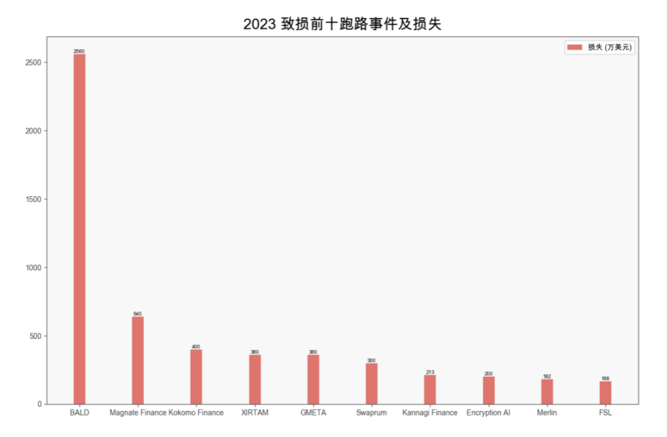 2023 年由于项目方跑路导致的安全事件共 117 起,导致损失约 8300 万美元。其中,Base 生态的损失最高,达 3250 万美元。其次是 BSC 生态,达 2305 万美元。