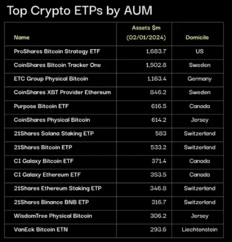 此外据 1kx Research 统计,目前 AUM(资产管理规模)最大的加密货币 ETP 是 ProShares Bitcoin Strategy ETF,这是一款美国的期货 ETF 产品,截至 2024 年 1 月 2 日持有资产 16.8 亿美元。