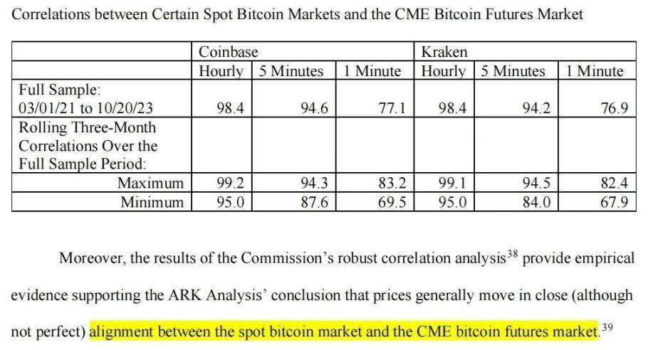 BTC 期货在 CME 已经是合规产品。因此,证明 BTC 现货与 CME 中 BTC 期货的价格相关性是最好选择。由此,SEC 对比 Coinbase 和 Kraken 两家加密交易所的 BTC 价格与 CME 期货价格的自 2021 年开始的相关性,发现两者高度相关。这就意味着如果 BTC 现货市场出现欺诈或操纵行为,这些行为很可能也会影响期货市场,从而被 CME 的监控系统所检测,从而监管可以进入控制风险。