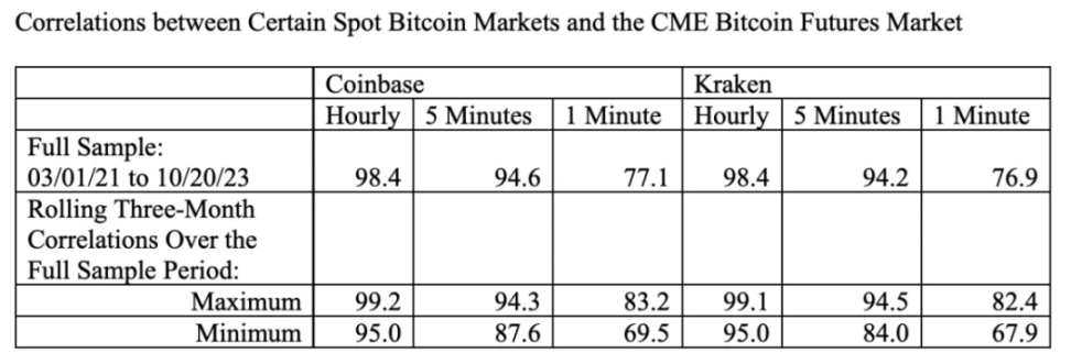 尽管在批准文件中已经测算了自 2021 年开始,Coinbase 和 Kraken 两家加密交易所的 BTC 价格(现货)与 CME 期货价格的相关性,按照小时来测算的话,其相关性高达 95% 至 99%。因此,若市场出现操纵,SEC 可以通过期货市场监测到。