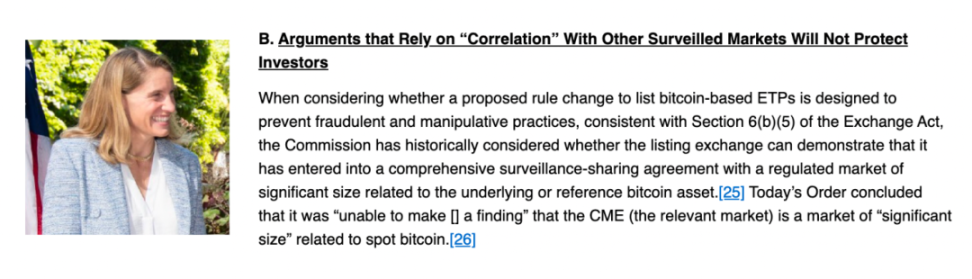而对于比特币 ETF 可能被操纵的顾虑,在来自 SEC 委员 Caroline A. Crenshaw 的声明中也做了详细的说明。她认为比特币 ETP 背后的全球现货市场因欺诈和操纵、集中和缺乏充分监督而陷入困境。