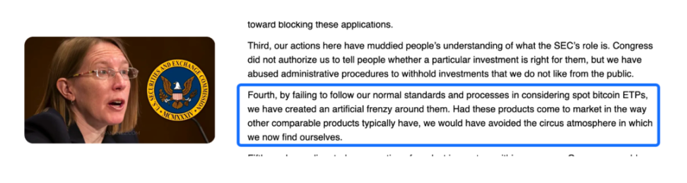 随着 SEC 的批准文件的发布,SEC 委员也发出了不同立场的声明,有来自 SEC 委员 Hester Pierce,Crypto 长期倡导者的支持,并阐述了这长达十年「拒绝」的思虑和她个人对 SEC 的看法,称「由于在考虑现货比特币 ETP 时未能遵循我们的正常标准和流程,我们在它们周围制造了一种人为的狂热。如果这些产品以其他同类产品通常的方式进入市场,我们就可以避免现在所处的马戏氛围」。