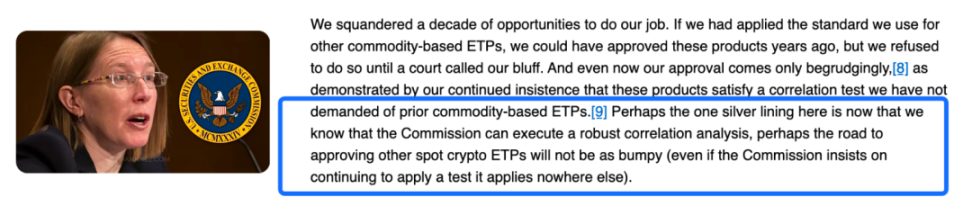 Hester Pierce 在其声明称「现在我们知道委员会可以执行稳健的相关性分析,也许批准其他现货加密 ETP 的道路就不会那么崎岖不平了。」