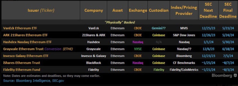 而对于以太坊,则处于模糊地带。不过各家金融巨头早已布局,通过下表,SEC 对于第一家 VanEck 申请的最终回复期限是在 24 年 5 月 23 日。
