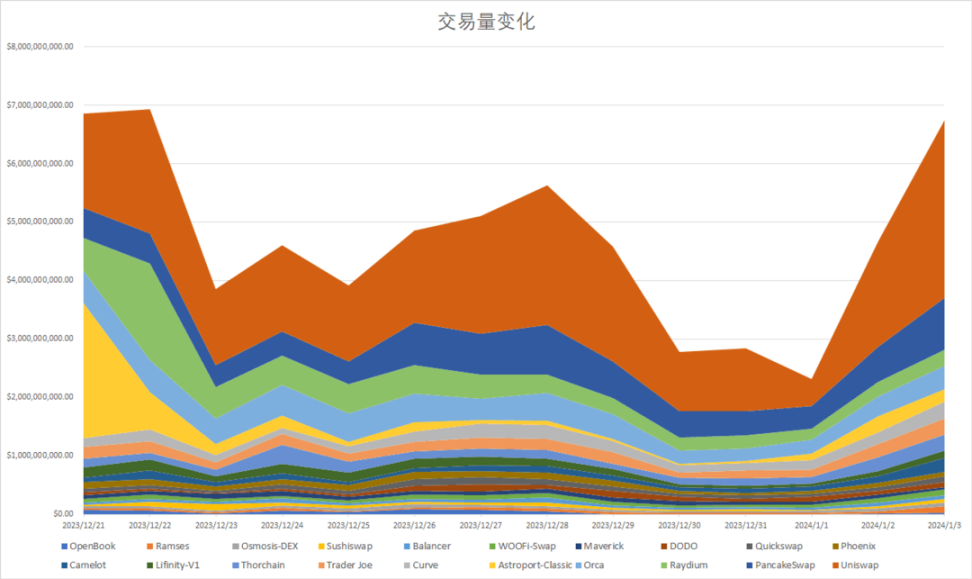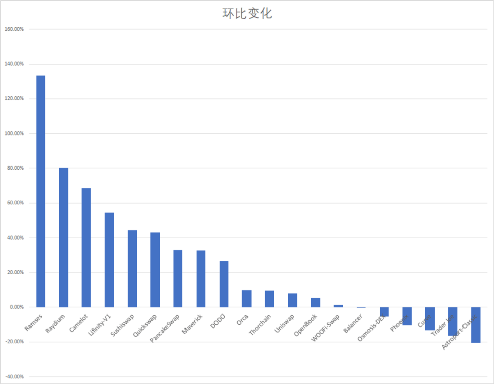 交易量方面,近两周市场整体交易量较上两周增长 13.01%。交易量增长明显的 DEX 仍然是 ETH 链之外的 L2 公链或其他公链的头部 DEX,比如 Raydium 受 SOL 链生态活跃影响,交易量环比增长明显,又如 Camlot 在 ARB 链的带动下,交易量明显活跃,ARB 代币也表现为强势。Astroport 是 Sei 链的主要 DEX,在过去两周的交易表现则略显颓势。