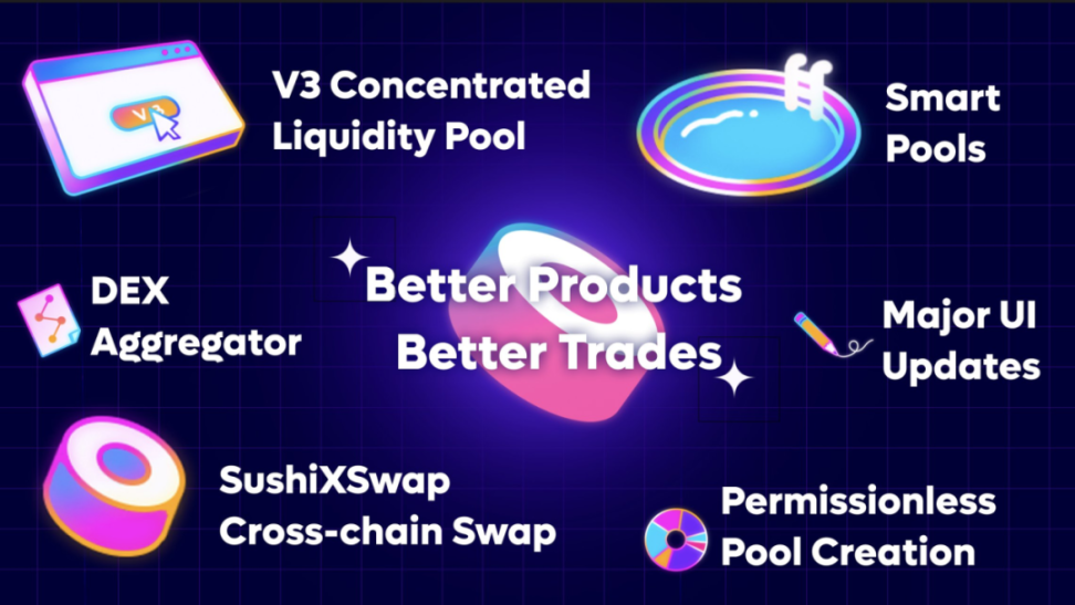 2023 年的新产品: 推出了 v3 AMM、DEX 聚合器、SushiXSwap v2、智能池和时尚的 UI 更新。