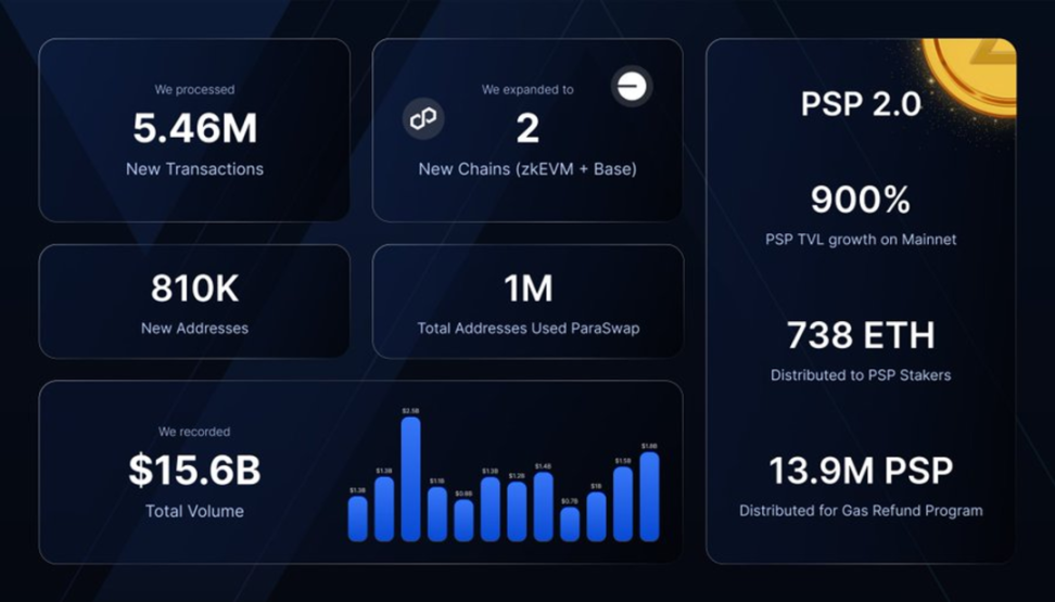 交易量和交易处理增长: 处理了 156 亿美元的交易量,完成了 546 万笔交易,超过 100 万个地址使用了 ParaSwap。创下了 6.97 亿美元的单日交易量新高。同时,还在 Polygon zkEVM 和 Base 两个新链上进行了扩展。