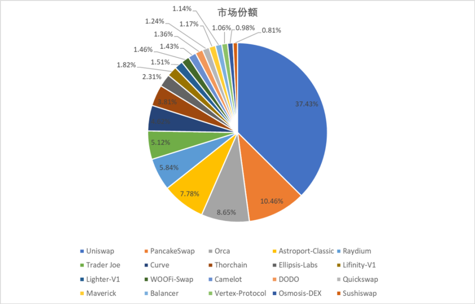 市场份额方面,Uniswap 份额依然被大幅压缩,以太坊生态近期表现堪忧,Raydium 超越 Orca 排名第三,Astroport 虽然环比交易量下降,但是依然强势地排在第四位。各个公链的头部 DEX 挺身瓜分市场的 “一超多强” 格局仍在进行时。