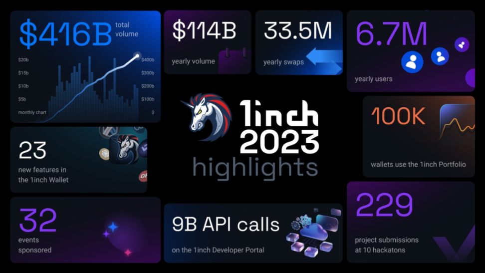 以太坊市场下滑,但 1inch 增长: 2023 年,以太坊的交易量下降了 7%,用户数量减少了 14%,但 1inch 在以太坊上的交易量增长了 70% 至 650 万笔,交易总额达到 830 亿美元。用户基数增长了 30%,达到 110 万。