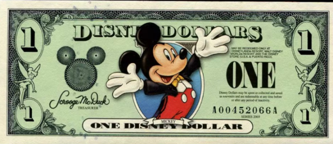 1990 年和 1991 年为了纪念迪士尼纸币被提交美国政府法案批准,首次成为可流通货币,特别发行了 1 美元面值的纸币(带首日封、华特·迪士尼图像邮票加盖邮戳,图案为米奇)。