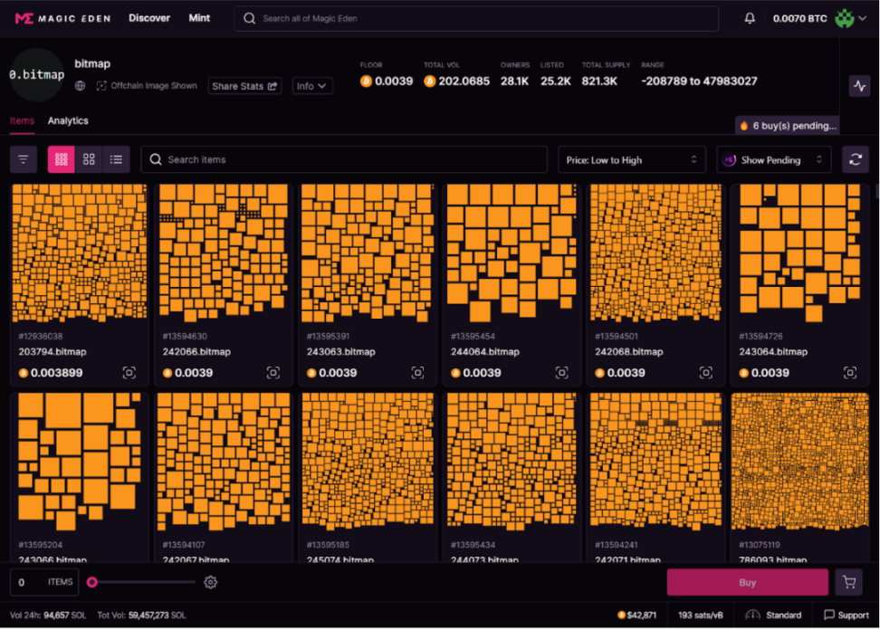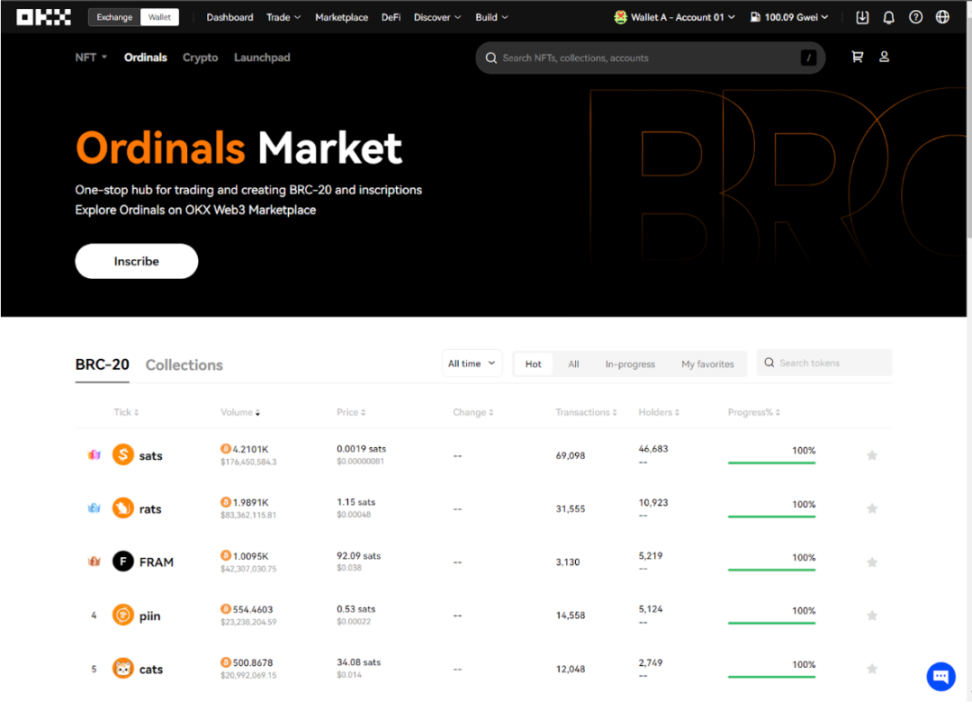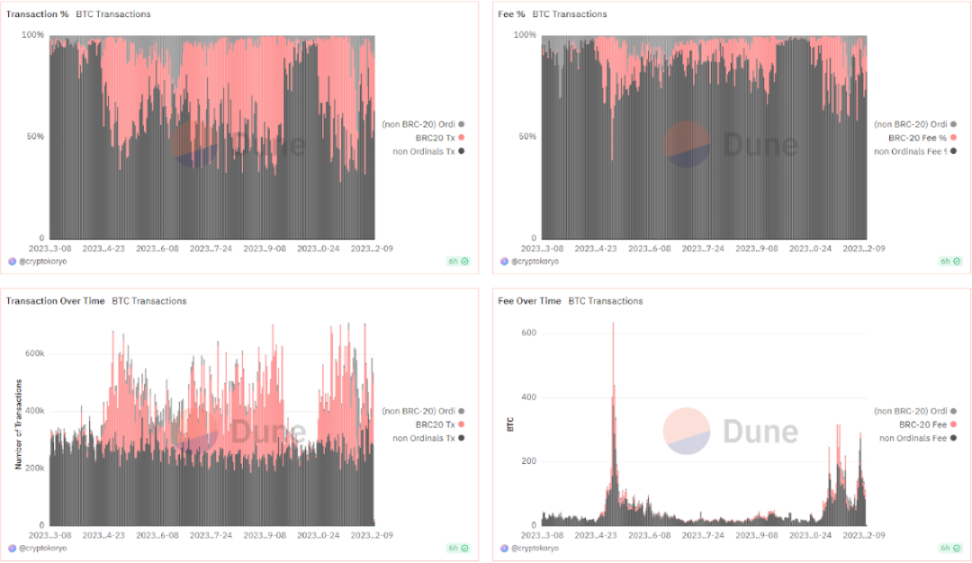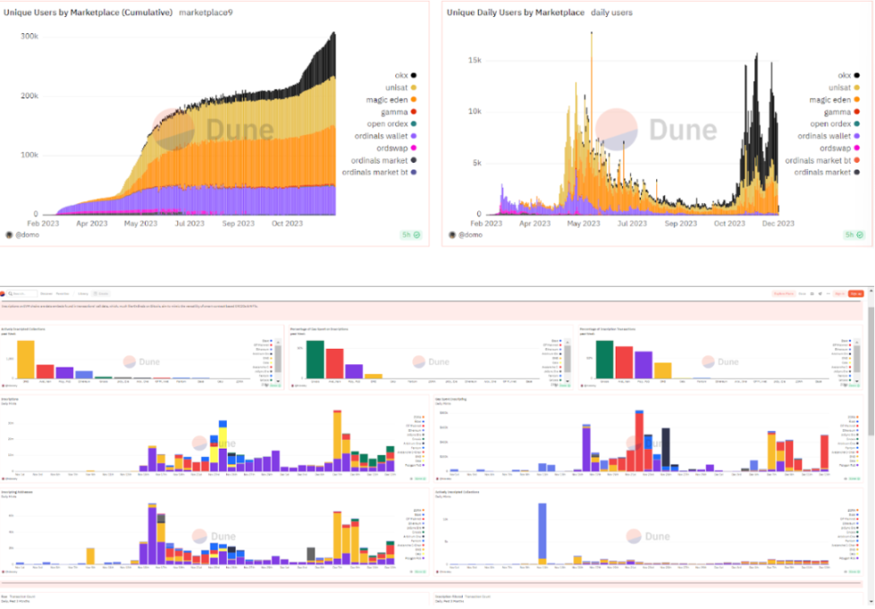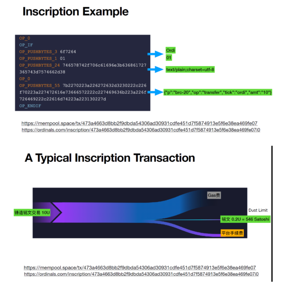 Brc20 ($mcap):Sats,比特币最小单位同名 meme 币;Ordi,最早的 brc20 币;Trac: 去中心化索引。Nostr Asset:Treat,Nostr Asset 协议治理代币;Trick,Nostr Asset 协议治理代币;Nostr。Atomicals:Atom,Realm,Arcs。非 brc20:AUCTION,launchpad + 扩容链;;MUBI,跨链桥;BSSB,资产平台;Turt,brc20 launchpad。ETHS: 以太坊上的铭文资产,基于 facet 平台FACET: 以太坊上的铭刻与交易平台,开发了自己的 Ethscriptions VM,主要用于解析以太坊上的铭刻交易。PAMP: Ethscriptions VM 上的 meme 币在过去三个月中,比特币矿工的收入有显著提高,特别是在 11 月,链上手续费贡献的占比从 8 月 19 日的 2.4% 上升至 11 月 16 日的 23.46%。这一增长主要得益于 Ordinals 交易对的引入。这表明比特币铭文市场的发展显著提高了矿工手续费收入的比例。预计到 2024 年 4 月的比特币减产时,这一比例可能达到 50%。当前,由于美国比特币矿场大部分时间处于亏损状态,且半导体行业面临制程瓶颈,矿机算力的竞赛趋于缓和。因此,矿工们可能会转向比特币铭文作为新的收入来源。例如,Ordinals 推出不到一年,市场已有超过五万个代币发行,mint 和交易数量迅速增长,这极大促进了矿工手续费收入的增加。铭文赛道的扩展不仅推动了矿工收益的增长,也可能成为比特币铭文赛道的主要推动力。然而,矿工们更关注的是交易次数的增加,而不是铭文价格的波动。主要原因是铭文本身消耗的手续费是惊人的。以最近正常的 200 sats/vB 的价格为例,这枚 Bitcoin Frogs 的图片内容大小为 3078 bytes (3kb), 需要消耗 61w sats 的手续费,这还不算其他内容以及给 tx 加速的手续费。61w sats 约等于 0.0061 BTC (1 BTC = 100m sats)。Bitcoin Frogs 整个 collection 有 1w 枚,因此如果在现在部署,仅部署内容就消耗了团队 61 BTC 的成本,这还不算其他费用。按 4w 一枚 BTC 的价格来算,仅这一图片的 gas 就消耗了 244 美金,整个 collection 的成本最低会是 244w 美金。社区访谈时也了解到有团队花了上千万美金的成本来部署 NFT。而这仅仅是项目方发币的成本。作为用户在打铭文的时候,200 sats/vB 左右的 gas 水平会带来 100-300 美金每笔 / 张不等的 gas 花费。高昂的成本和绝对的公平发射造就了绝佳的 meme 游乐场。比特币网络上的交易数据显示 brc-20 与 oridinals 的交易量已经占了很大比重,一度可以超过 50%。足见铭刻资产在比特币生态内已经占据了相当大的比重,很难想象这个资产类别会完全消失。新的资产往往会伴随新的交易平台出现。赛道早期由社区自建的 marketplace 所统治。而随着赛道的逐渐成熟,可以看见目前的交易量和交易笔数主要由三巨头占据:OKX,Unisat 以及 Magic Eden。除了原有平台自带的巨大流量,更好的用户体验也是关键。BTC 生态的基础设施发生了进步。主要在以下几点:(iii)许多新项目将 zk 等以太坊生态有落地的技术搬到比特币生态来达到链外扩容的目的这些基础设施的进步如果横向比较,在可扩展性,安全性和去中心化上相较以太坊生态等其他 L1 L2 并没有绝对优势,但是在比特币生态内依然是 10X 乃至 100X 的提升,足够支撑一段时间内的用户和资产增长。铭文的技术思路可以简单理解为把 security, consensus 和 liveness 放在 BTC 链,把 settlement 放在 indexer。从 use case 角度来看,铭文的 fair launch 模式是一个足够大的创新,支撑起了这一轮比特币赛道的行情。(i)由于可编程性的限制,铭文都是 fair launch,几乎不可能实现更加复杂的把用户区别对待的逻辑,如 ICO 时期的 pre-mine,defi 代币的锁仓,NFT 的白名单机制等。铭文的标准格式公布后就立马支持 mint(用户甚至可以提前 mint,不过大概率会被 indexer 忽视),只由矿工网络决定哪个用户的 tx 被区块包括。整个过程都非常公平,完全比拼的是用户的信息差和对 gas 的支付意愿。(ii)使用铭文的门槛随着工具的普及和教程的出现逐渐降低,散户和科学家的优势被更好用的无代码铭刻和交易工具填平,老鼠仓的优势被监视链上铭刻行为的 bot 填平(iii)受限于基础设施,严肃团队构建更复杂 use case 的环境依然恶劣,用户质量也不匹配,很难与其他生态形成除了新资产类别以外的竞争优势。(iv)本质上是使用已有技术创造的新资产类别的行情,上行趋势同步于宏观环境(i)BTC 生态很大程度上错过了过去的 1-2 个牛市,矿工需要新的收入来源,创造更好的财富机会符合这个需求(ii)熊市中后期 fair launch 成功的难度变低,市场情绪比牛末和熊初更容易调动(iii)技术限制确保的绝对公平发射让散户赚钱成为了熊市的可能,牛市的必然(iv)BTC 网络足够稳健,很难出现宕机和错误,保证了绝大部分用户的资产安全和使用体验。经过大量社区用户与项目方的访谈,得出了一些初步结论,做了一些推理。(i)目前受限于基础设施发展,应用很难做复杂,铭文最大的 use case 就是 meme;(ii)用户的获取和留存都高度依赖公平发射的属性;(iii)给铭文资产赋能仅限于非常简单的场景,如存币打新等;(i)公平发射作为资产发行方式有本质瑕疵:项目方缺乏长期认真做事的激励,很容易烂尾;用户只关心资产收益表现,容易造成劣币驱逐良币;(ii)即将到来的牛市里其他生态会有更多经过熊市沉淀的好项目上线,可能会吸引走更多的资金,造成公平发射项目平均价格表现进一步下降;(iii)打铭文是一个好的公平分配利益给用户的方式,确保用户之间的公平性;(iv)打铭文是一个比直接与智能合约交互更便宜也更安全的操作:只需