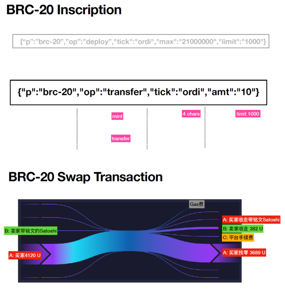 维持比特币的庞大算力需要同等规模的收入。随着比特币区块奖励的减半,提升手续费收入迫在眉睫。特别是在熊市的背景下,矿工需要更多的收入。2022 年是矿工受重创的一年,多重成本同时上升:资金成本随着加息飙升,能源价格上涨,挖矿电费上升。BTC 价格下跌,容易导致两个恶性循环。首先是 BTC 价格的恶性循环:逼近矿机停机价——矿工抛售——BTC 价格下跌——矿工利润下降——更多矿工抛售。其次是矿机价格的恶性循环:矿工破产——矿机打折出售——矿机被以低于市场价成本收购,重新开机回到市场——hash rate 上升——挖矿难度上升——更多矿工破产。众多矿企在熊市的股价表现也充分展现了熊市的残酷。与此同时,以 ordinals 为代表的基于比特币铭文的新资产类别受到市场热捧。其产生的手续费给矿工们以足够的收入,活过了严酷的熊市,直至目前的牛市初期。我们将从技术路线和头部产品形态两个角度来观察这个新的资产类别,并尝试剖析其中存在的投资机会。2017 年的隔离见证(「SegWit」)改变了比特币的交易结构,将其分为交易数据和见证数据两部分。这一改变引入了区块权重的新概念,其中见证数据的权重仅为交易数据的 25%。这一措施实际上扩大了比特币的区块大小,使得在交易的见证部分存储数据变得更加容易且成本更低。从根本上讲,SegWit 使比特币的最大区块大小从 1 MB 增加到了 4 MB(包括 1 MB 的交易数据和 3 MB 的见证数据)。2021 年的 Taproot 升级,虽然被支持者誉为将智能合约引入比特币,但自上线一年多以来,其应用尚未广泛。Taproot 通过将复杂的智能合约(如多签名钱包、支付通道等)在区块链上的表现形式简化为普通比特币交易,提升了隐私性和可扩展性。比特币脚本(Bitcoin Script)是一种简单的脚本语言,用于编写和执行比特币交易的逻辑,其设计目的是为了提供灵活的方式来设定比特币交易的解锁和锁定条件。Taproot 的两大影响是:允许在块的见证部分进行高级脚本编写,以及消除块的两个部分间的数据限制,即在见证部分中允许最多 4 MB 的数据。2023 年 1 月推出的 Ordinals 将 Taproot 与序号理论结合产生了具有额外铭文的 sats。序号理论将 1 btc 等于 100M sats,并为比特币的 2.1 千万亿个 sats 每个分配了独一无二的标识符。单独的 sats 可以被铭刻任何铭文,如文本、图像、视频,上限为 4MB。使用 ordinal wallet 是必要的,以防止不小心使用了带铭文的 sats。与 NFT 的对比在于,Ordinals 具有序号、数量有限,并且完全存储在链上。此外,Ordinals 带来的好处包括增加了矿工的交易费用收入,提高安全性,并带来了新的叙事。然而,它也带来了一些弊端,例如节点存储的增加、内容审查的困难、以及可能导致费用上升的问题。在这一领域活跃的相关参与方包括 Xverse、Gamma 以及其他一些公司,它们迅速添加了 Ordinals 支持并推出了相关产品。著名的 NFT 工作室 Yuga Labs 和 DeGods 也都在上个月发布了基于 Ordinals 的项目。铭刻操作和 BRC20 标准的推出是根据先到先得的原则进行的。每个人都可以上传 Punk 到比特币网络中,但只有最早的 Bitcoin Punk 才是正宗,这实际上是一种共识。但是,由于一些批评声指责其占用网络存储资源,这种热潮逐渐冷却。当 Ordinals 协议中附加的信息设为统一的标准时,Ordinals 协议不仅可以发布非同质化代币(NFT)还可以发布同质化代币(FT)。ORC-20 在代币名称的自由度上超越了 BRC-20 标准。与 BRC-20 仅允许使用四个字母的单词作为名称(符号)不同,ORC-20 允许使用任意长度的单词作为「tick」。例如,第一个部署的 ORC-20 代币「ORC」就是由三个字母组成。此外,ORC-20 标准还引入了在初始部署之后修改总供应量和每次铸币最大数量的功能,为代币经济实验提供了更多的灵活性。这种功能可以通过正确指定「tick」和「id」,并将升级功能铭刻到 Sat 中来实现。例如,可以将供应量从 21,000,000 调整为 2,100,000,将发行限制从 10,000 修改为 1,000,并将「ug」设置为「false」以禁止未来升级。每次升级后,ORC-20 代币的版本「v」会自动递增 1。在 UTXO 模型方面,ORC-20 引入了此概念用于代币的转移,这与 BRC-20 有明显区别。比如 A 向 B 发送 2 美元,B 原有 1 美元,在 UTXO 模型下,B 的余额将展示为两个单独的 UTXO,而不是简单的 3 美元总和。此模型的优势在于 UTXO 只能使用一次,有效防止了双重支付的问题。要发送 ORC-20 代币,需要将相应文本铭刻到 Sat 中,并在最后添加铭文以将剩余余额发送回发送者。这一过程类似于 UTXO 的处理方式,如果最后的铭文未执行,还可以在中间取消交易。Atomicals 是针对 Ordinals 和 BRC20 的优化项目,专注于同质化代币,并解决了 BRC20 过分依赖中心化链下索引的问题。Atomicals 利用并扩展了比特币的 UTXO 模型,将每个聪(比特币的最小单位)的 UTXO 作为一个特定的 Atomical 代币或数字对象,从而在比特币上创建和管理复杂的数字对象和代币系统(ARC20)。在 ARC20 铸造过程中引入了 POW,铸造者必须计算出特定前缀字符的哈希值才能进行铸造。Atomicals 协议为 ARC-20 提供了 Bitwork Mining 的前缀参数设置,使参与者可以直接挖铭文 /NFT。ARC-20 代币标准忠实于比特币原教旨主义原则,预计未来相关工具的出现将增强其流动性。比特币的最新升级 Taproot 一升级使得将资产元数据直接嵌入比特币输出成为可能。它还支持闪电网络上的多跳交易,确保了终端用户