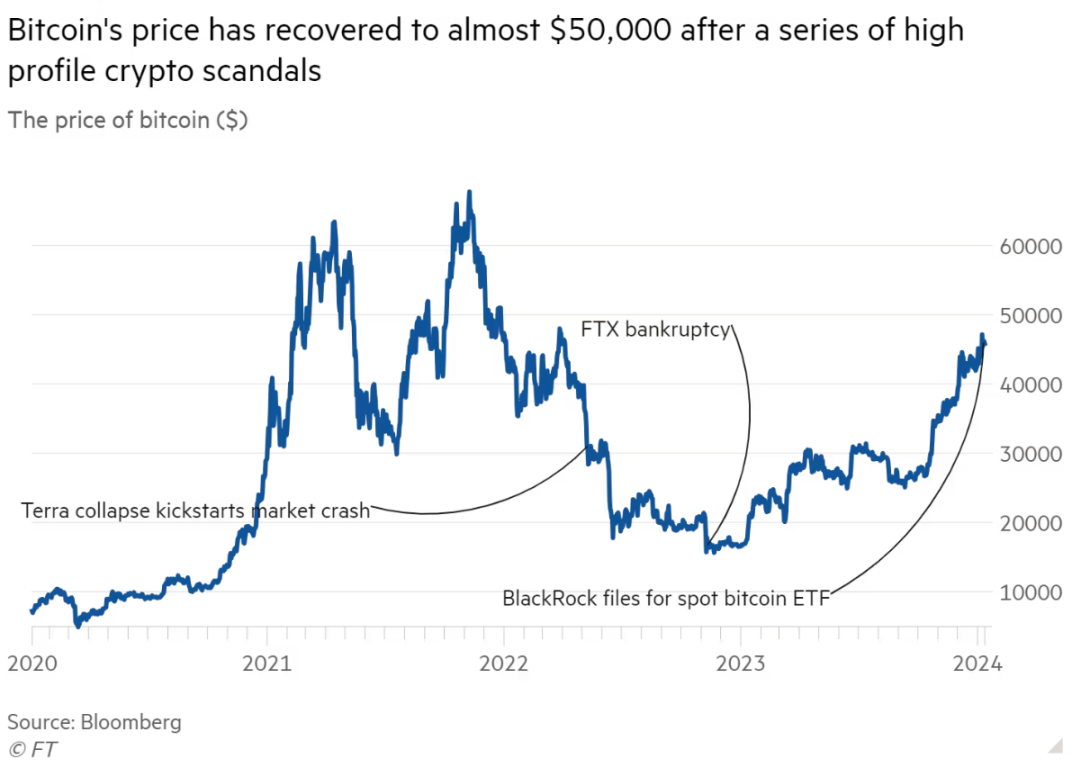 通过这些基金,投资者可以通过上市的受监管工具拥有比特币,而无需直接持有加密货币本身。这些基金由华尔街巨头包括贝莱德、英威诺和富达管理,与去年因洗钱和违反国际制裁而被美国当局罚款 43 亿美元的 FTX 和币安等基本无监管的交易平台形成鲜明对比。