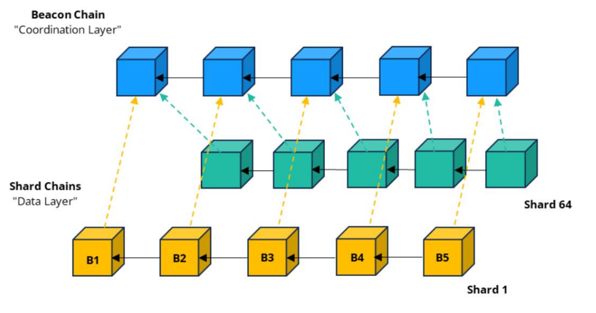 Dencun 升级的核心之一即 Proto-Danksharding 模块的引入。Proto-Danksharding 也是为了以太坊最终的分片扩容做准备。最早的以太坊扩容计划是打算将以太坊分割成不同的分片,把主网的计算负载分配到各个分片中,每个独立的分片各自保存以太坊上发生的交易数据的子集,并行地处理交易,从而提高以太坊的 TPS。最初的 ETH2.0 计划最终将主网划分为 64 个分片以实现 10 万 + 的 TPS。
