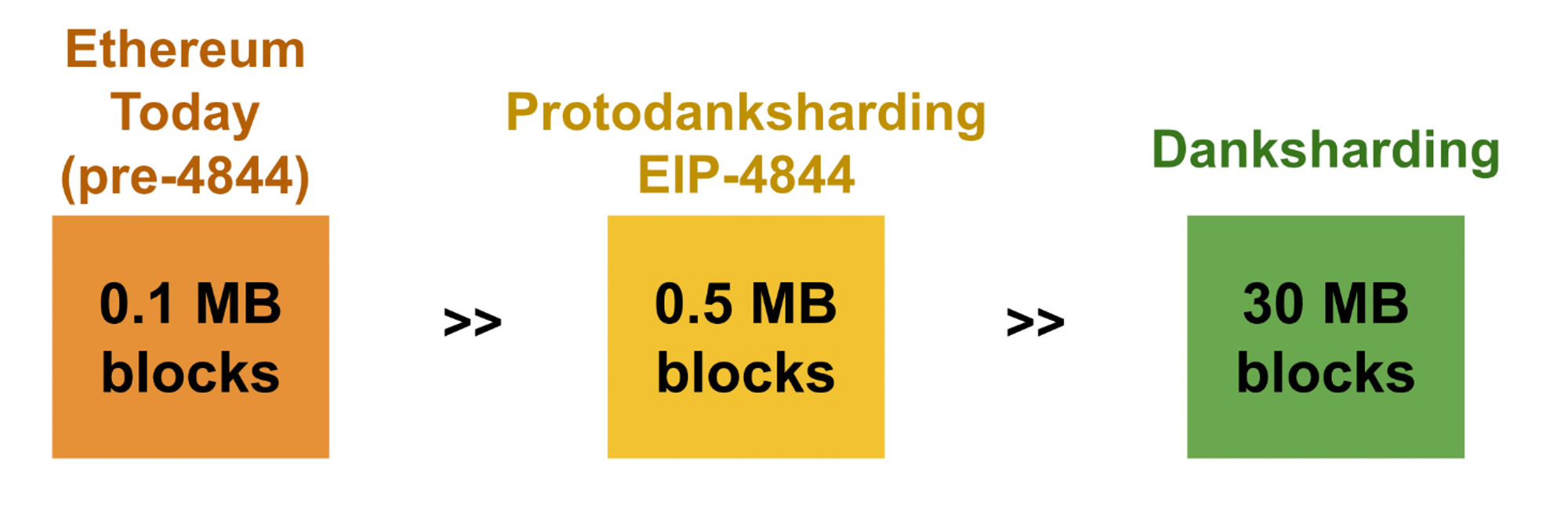 Proto-Danksharing 所引进的每个 blob ⼤⼩为 128 KB,每个以太坊区块计划包含 3–6 个 blob(0.375 MB — 0.75MB),未来逐步拓展至 64 个。