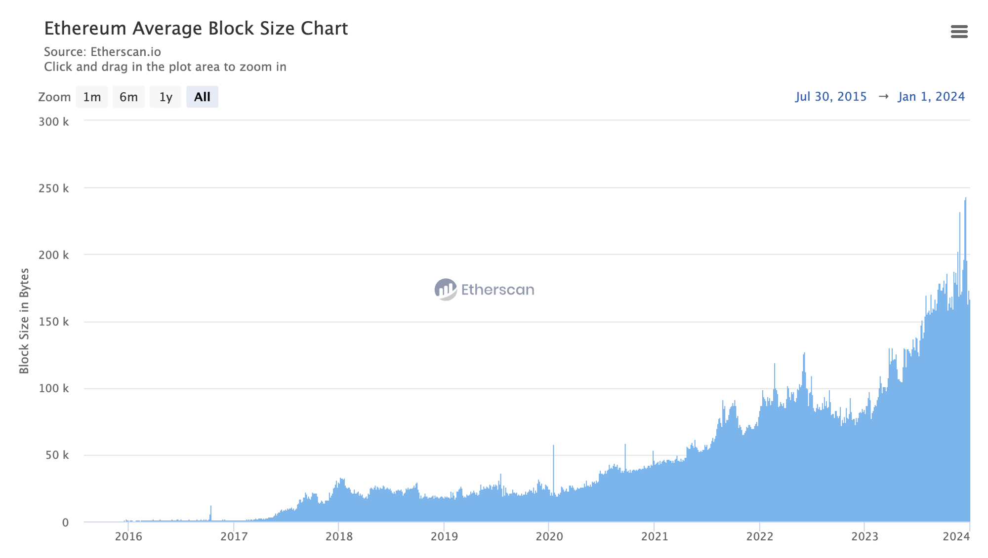 相比之下,目前以太坊每个区块可以容纳的数据大小不到 200KB,引入 blob 后,以太坊区块可容纳的数据量将显著提高。