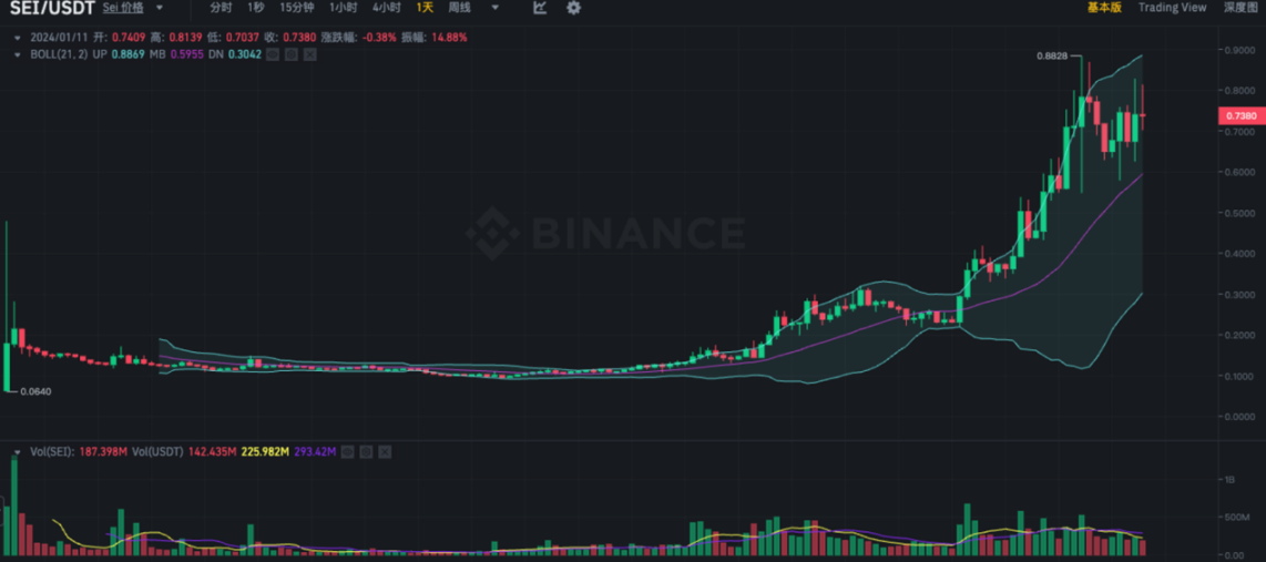 Since its launch on August 15, 2023, SEI has experienced a prolonged period of declining prices for approximately three months. However, starting from November 22, the token has shown a significant surge from around $0.14 to its recent peak of $0.88. On January 3, it touched the upper band of the Bollinger Bands before retracing, accompanied by a slight decrease in daily trading volume.