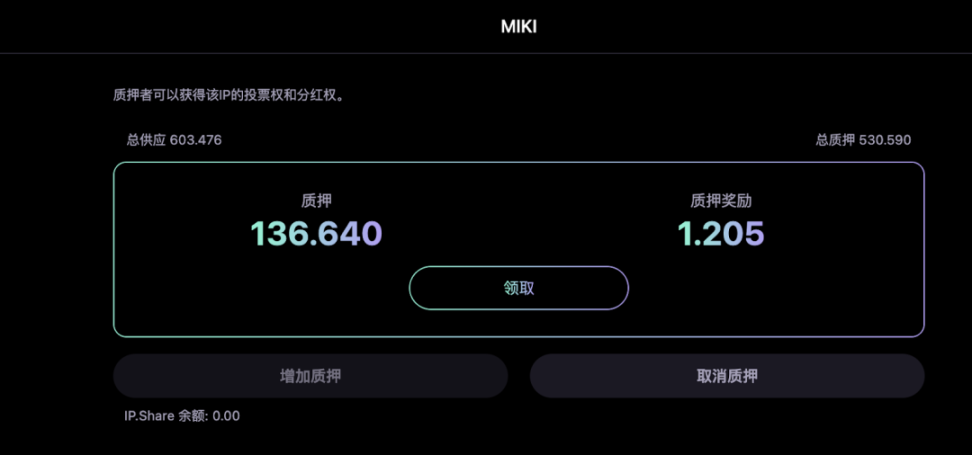 当有资金买入相应的 IP Share 时,除了造成 IP share 价格上涨外,还会铸造出新的 IP Share,这些新增的 IP Share 将分配给相应的 IP Share 质押者,分配则是根据用户的质押比例进行。