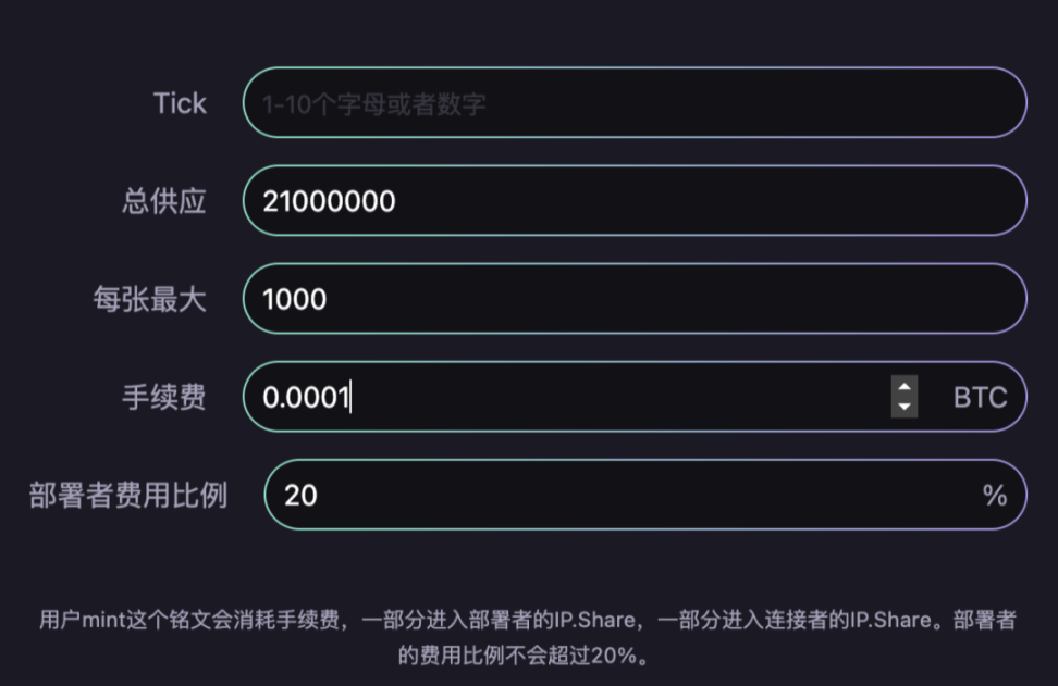 在发布铭文时,需要设置几个参数,除了铭文名称、张数、每张最大量外,其中还包括手续费和部署者费用比例。