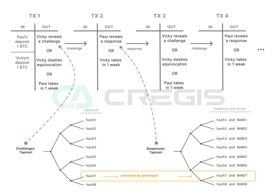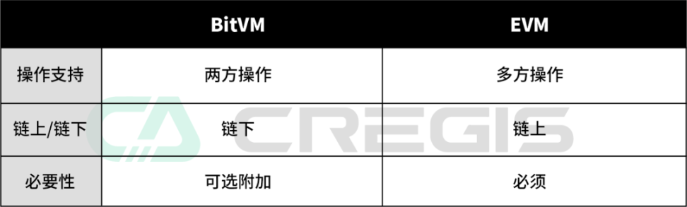ZeroSync 项目负责人 Robin Linus 在 10 月 9 日公布了关于 BitVM 的论文(BitVM: Compute Anything on Bitcoin)。简单来说 BitVM 就是比特币网络的虚拟机,其通过链外执行和链上验证的方式,实现在不改变比特币网络共识规则的情况下,达到图灵完备的效果。BitVM 和以太坊智能合约相比还存在着很大的区别,以太坊智能合约能够支持多方(multi-party)交易,但是 BitVM 的设计仅能够支持两方(two-party)交易交换。BitVM 的大部分交易处理都是在链外进行的,最大限度地减少了对底层比特币区块链的影响;与 BitVM 不同,EVM 是一个链上引擎,所有操作都在以太坊的本机环境中进行;BitVM 是比特币区块链的可选附加引擎,其自身的操作不需要 BitVM。相比之下,EVM 是以太坊区块链不可或缺的一部分;没有 EVM,就没有以太坊。BitVM 的功能是通过比特币 Taproot 升级实现的。BitVM 主要依赖于 taproot 地址矩阵(taptree),类似于二进制电路的程序指令。在这个框架下,每个 Script 脚本中的 UTXO 花费条件指令被视为一个程序最小单元,通过 taproot 地址中的特定代码生成 0 或 1,构成 taptree。整个 taptree 的执行结果是二进制电路文本效果,相当于可执行的二进制程序。程序的复杂性取决于组合的 taproot 地址数量,地址越多,Script 预置的指令越丰富,taptree 能执行的程序也就越复杂。BitVM 大部分处理都是在链下进行的,链下处理的交易被捆绑成批次并发布到底层比特币区块链,利用类似于乐观汇总(Optimistic-rollups)中使用的有效性确认模型。同时,BitVM 使用将欺诈证明与质询响应协议相结合的模型来处理和验证两方(证明者和验证者)之间的交易。证明者发起计算任务,并通过自己和验证者之间建立的通道发送该任务,然后验证者确认计算的有效性。一旦经过验证,该交易将被添加到整理的整个批次中,以便发布到底层的比特币区块链。(二)RGB