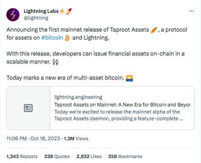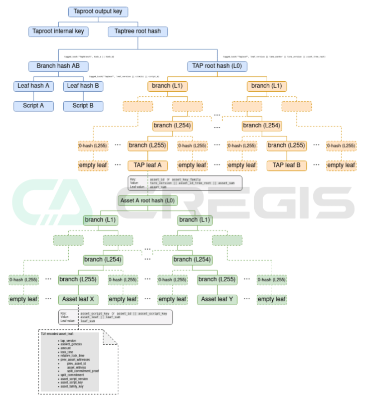 Taproot Assets 协议(前身 taro)由 Lightning Labs 在今年 10 月发布,Taproot Assets 协议支持在比特币和闪电网络上发行稳定币和其他资产。Taproot Assets 协议将比特币主网当作 Token 注册表,仅在比特币主网的 UTXO 中写入代币信息,并不存储代币的转账、铸造等功能。Taproot Assets 协议发行的所有资产信息由“Taproot Assets universe”保存,它保存有关已发行的资产、数量和规则的信息,并保存有关最近转移的证据。2023 年 10 月,比特币第二层基础设施开发商 Lightning Labs 在主网上发布了 Taproot Assets 协议,支持在比特币和闪电网络上发行稳定币和其他资产。2022 年 11 月 15 日:Lightning Labs 发布 taro v0.1.0 版本2023 年 5 月 16 日:Lightning Labs 发布 Taproot Assets v0.2.0 版本2023 年 10 月 18 日:Lightning Labs 在官方 x 上宣布 Taproot Assets v0.3.0 版本为第一个主网版本,通过此版本可以在以扩展的方式在链上发行数字资产。Taproot Assets 是基于 Taproot 升级设计出的比特币链上协议。Taproot Assets 使用“Merkle Sum、稀疏默克尔树 (MS-SMT)”和“Taptweak”来承诺定义资产的创建和所有权的信息。Taproot Assets 依赖于 Taproot 来实现新的树结构,允许开发人员在现有输出中嵌入任意资产元数据。在 Taproot Assets 框架下创建资产需要执行一次单独的链上根交易(Taproot transaction),在这一交易中,对于可以铸造的资产数量以及可以持有这些资产的账户数量没有限制。实现资产转移,需要重新组织默克尔树并发布一个新的链上交易。这一单独的链上交易可以反映无限量的内部 Taproot Assets 交易。采用这种方法,资金被分配给账户持有者,而且在进行 Taproot Assets 交易时,所有资金的移动和分配都被记录在这个单一的链上交易中。通过这种方式,Taproot Assets 允许在比特币网络和闪电网络上上进行复杂的资产管理和交易。目前 Taproot Assets 生态尚处于发展初期,成熟的项目较少。其中最著名项目为 Nostr Assets,Nostr Assets 现在一共创建了两种代币 Trick 和 Treat,并且向 ordi 持有者发放空投。交易成本低:Taproot Assets 与闪电网络集成,并不是完全依赖比特币主网运行,因此这些资产必须被存入闪电网络中才能进行交易,因此交易成本相比主网要低。主网资源占用少:Taproot Assets 只在比特币主网的 UTXO 中存储代币的信息,并不存储代币转移等功能信息。中心化:Taproot Assets 的代币依赖第三方存储索引器,离开了存储索引器这些代币将永远地丢失。因此,用户需要独立运行比特币全节点和 Taproot Assets 客户端,否则将完全依赖中心化的服务器交易 Taproot Assets 代币。分发方式:用户不能直接在比特币主网中自助地铸造代币,而是需要项目方(一个地址)一次性铸造所有代币,然后再由项目方地址转入闪电网络进行分发。其中项目方本身也可以预留代币。(一)Lightning Network
