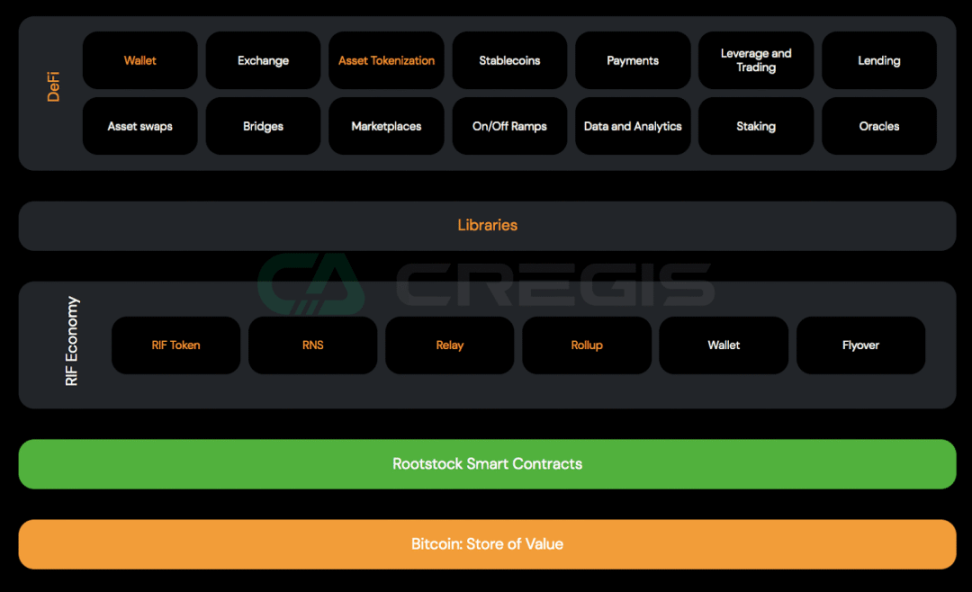 Rootstock (RSK) 是由 RSK Labs 开发的基于侧链的比特币二层网络解决方案,于 2018 年在比特币主网上推出,引入了智能合约功能。作为比特币网络上的 EVM 兼容侧链,RSK 允许开发者使用以太坊的语言构建 dApp 和智能合约,并整合进比特币生态系统。2016 年:RSK Labs(后更名为 IOV Labs)成立。2018 年 1 月:RSK 主网上线,实现了比特币双向锚定、联合挖矿、交易转账、智能合约部署等功能。2018 年 11 月:RIF Labs 通过 RSK 智能合约平台发行 RIF OS,同时与 RSK 合并。该项目扩展了 RSK 协议,增加了多种 P2P 功能。2019 年 5 月:发布了 RIF 的一个核心组件,Lumino 网络,RIF Labs 随后更名为 IOV Labs。2023 年 2 月:IOVLabs 推出 RIF Flyover 协议,促进比特币主网和 RSK 侧链间的 BTC 转账。2023 年 5 月:IOVLabs 推出了 250 万美元的资助计划,支持 Rootstock 的采用。Rootstock (RSK) 的项目架构可以简要概述为以下三个核心组成部分:合并挖矿:RSK 允许比特币矿工同时挖掘比特币和 RSK 区块,提高了开发者的收益潜力。由于 RSK 和比特币使用相同的工作量证明 (PoW) 共识机制,矿工能够同时挖掘两个区块链。这种合并挖矿方式不仅提高了矿工的盈利能力,还保持了比特币区块链的安全性。Powpeg:这是一个双向桥梁,用于在比特币和 RSK 区块链之间转移比特币。通过 RSK 的资产 smartBTC (RBTC) 实现,这个桥梁允许用户在两个区块链之间无缝转换资金,无需额外费用。RSK 虚拟机 (RVM):RVM 是基于以太坊虚拟机的,允许在 RSK 上执行以太坊智能合约。这为开发人员提供了一个使用 Solidity 编码的平台,可以在 RSK 上构建与以太坊兼容的应用程序。RIF OS (Root Infrastructure Framework Open Standard) 建立在 Rootstock 之上,为开发者提供了一系列基础设施和服务,支持 DeFi、存储、域名服务和支付解决方案等。RIF OS 旨在通过提供开放和去中心化的工具,降低开发人员采用区块链技术的门槛,促进去中心化基础设施服务的公平市场发展。(四)Liquid