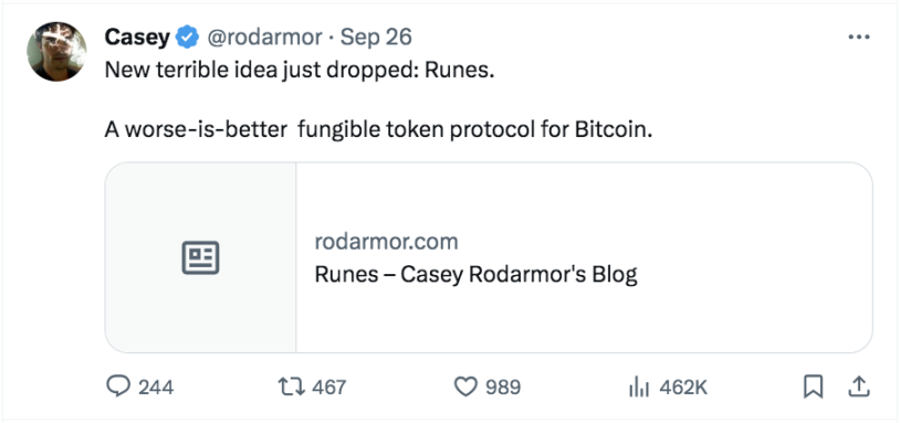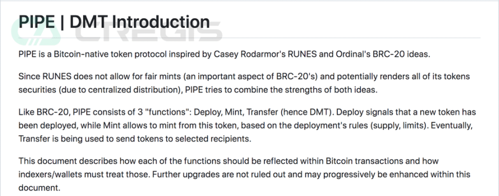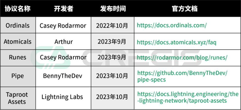 Runes 协议和 Pipe 协议都是比特币网络的铸币协议,只不过前者是技术构想,而后者是对前者的技术实现。Runes 协议是由 Ordinals 开发者 Casey Rodarmor 提出一个技术想法,公布在了个人博客当中。而 Pipe 协议则是 BennyTheDev 基于 Casey Rodarmor 的技术想法编写的一个可用协议。Pipe 的协议设计和 ARC20 非常相似,同样是直接向 UTXO 中写入铸币数据(部署、铸造、转移),然后将转账直接交给比特币主网来处理。2023 年 9 月 26 日:Ordinals 开发者 Casey Rodarmor 在 x 上公布了关于 Runes 协议的博客文章。2023 年 9 月 27 日:BennyTheDev 基于 Casey Rodarmor 的 Runes 和 Ordinals 以及 BRC-20 开发出 Pipe 协议2023 年 11 月 2 日:Casey Rodarmor 在一次 space 中表示,将暂停开发 Runes 协议,继续专注优化 Ordinals 协议。Pipe 协议的作者 BennyTheDev,同时也是 Trac System 的创始人。Trac Systems 将 Pipe 协议列为其生态系统的重要组成部分。(四)Taproot Assets