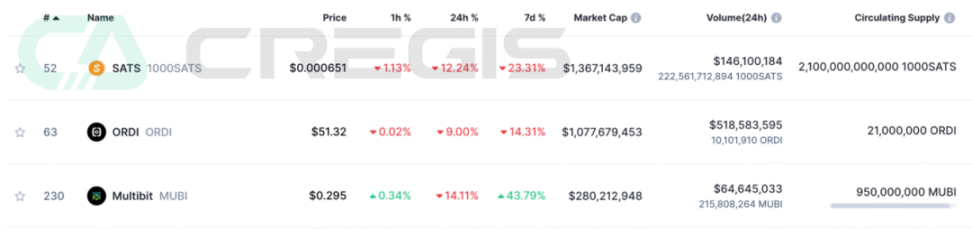 Ordinals 协议由开发者 Casey Rodarmor 于 2022 年 6 月在其 Github 中发布。ordinals 协议利用比特币区块链的特性,允许对每个 Satoshi(比特币的最小单位)进行独特标记和跟踪。Ordinals 的核心理念是通过称为"inscription"的过程,将文本、图像和视频等元数据附加到单个 Satoshi 上,从而创造出独一无二的数字资产。用户可通过开源项目 ord,实现链上数据存储。2020 年 1 月:比特币核心开发者 Pieter Wuille 发布了 BIP 341 和 BIP 342 比特币改进提案为今天的比特币生态带来了可能性。2022 年 6 月:Casey Rodarmor 对 BIP 342 中的 Tapscript 做了技术延伸与扩展,并且提出了比特币“Ordinals(序数)”和“inscription(铭)”技术概念,实现了为每个聪分配唯一编号并添加注释来实现扩展的功能。2023 年 3 月:Domodata 进行 BRC-20 实验,通过 Ordinals 协议和 inscriptions 功能,向比特币链上存储 json 数据,证明链下代币余额状态,变相的实现了向比特币生态发布代币的功能。2023 年 12 月 9 日:国家漏洞数据库将 Ordinals 铭文功能正式编号为 CVE-2023-50428Ordinals 协议本质上是基于比特币的 Taproot 升级和隔离见证(SegWit)技术,通过操作码将任意数据存储在隔离见证当中,从而实现了链上存储的功能。目前国家漏洞数据库正式将 Ordinals 的“inscriptions”功能,编号为 CVE-2023-50428。Taproot 升级的主要目的是提高比特币的隐私性和扩展性,而不是用于向区块链写入数据。Taproot 升级后,可以在创建见证脚本时,使用“OP_FALSE”,“OP_IF”等操作码将任意数据当作签名数据嵌入在脚本中。当进行交易时,签名数据将从交易主体中分离,通过操作码带入的任意数据将存储在见证数据(Witness data)当中。Ordinals 通过上述方法绕过了数据载体大小限制,在任何比特区块的见证数据(Witness data)部分存储上限为 4MB 的数据,变相实现了铸造 NFT 的功能。2023 年 3 月,Domodata 基于 ordinals 协议开发了 BRC-20 铭文标准,利用 Satoshis( 聪 ) 来存储和管理代币的各种信息,如代币名称、符号、总量等,将这些信息以 JSON 格式编码后写入 Satoshis( 聪 ) 中,组成了一个一个的铭文 (inscriptions)。最后通过汇总所有铭文 (inscriptions) 的交易活动,便可以找到 BRC-20 数字资产的余额状态,从而实现了数字资产的部署、铸造和转账功能。基于 Ordinals 协议和 brc20 标准铸造的数字资产,市值前三的有“SATS”,“ORDI”和“MUBI”,其市场表现情况如下图:Ordinals 协议为比特币生态系统既带来了积极影响,也引发了一些担忧。积极的影响主要体现在市场热度和矿工收入方面。吸引用户:Ordinals 协议和 BRC-20 标准的组合,可以使得用户在比特币网络中铸造数字资产,例如“ordi”的价格暴涨,吸引了大量的用户以及开发者参与到比特币生态当中。同时,2023 年 11 月,比特币链上交易数量环比 (MoM) 增长 62%,这主要是由于 Ordinals 和 BRC-20。矿工收入:比特币矿工收入来自区块奖励和交易费用,由于 Ordinals 和 BRC-20 的市场热度影响,比特币每笔平均交易费用从今年 5 月初就出现大幅增长,3 月粉手续费仅为 0.19BTC,5 月份便达到 4.85BTC。链上数据:通过 Ordinals 协议存储的数据是额外的非财务数据,这些数据将永远包含在区块链中。那些希望运行全节点的人将需要花费更多的硬盘空间。随着时间的推移,运行比特币全节点的要求将不断升高,从而导致验证链的全节点更加集中。交易费用:Ordinals 的出现会导致节点运营商运行全节点的成本增加,提高交易费用,增加链的负担,并可能对那些想要进行链上交易的用户产生负面影响。(二)Atomicals