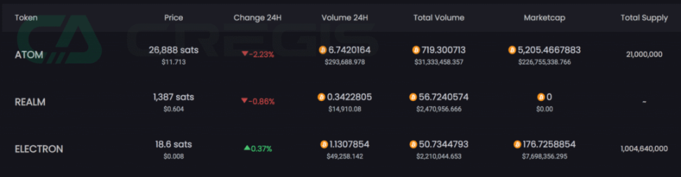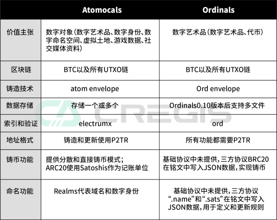 Atomicals 协议由 Arthur 开发,在 2023 年 9 月发布。Atomicals 的使命是“永久归还个人数字主权的控制权,并巩固比特币作为工作量证明灯塔的地位。”Atomicals 协议基于 BTC 的 UTXO 进行铸造和传播,1 token = 1 sat。Atomicals 协议内部集成了 ARC-20 铸币标准,可用通过其开源工具 atomicals-js 实现铸币功能,无需借助第三方工具及铸币标准实现资产铸造功能。同时,Atomicals 是一个基于工作量证明的的资产铸造协议,需要通过电脑 CPU 挖矿,才能获得数字资产。相比 Ordinals+BRC-20 利用 gas 的资产铸造方式要更有技术门槛,且不会为比特币网络带来额外的负担。2022 年 6 月 -2023 年 3 月:Ordinals 协议 +BRC-20 标准为比特币生态带来了新的活力。2023 年 9 月:Arthur 曾在 Ordinals 上开发域名 DID 相关的项目,发现 Ordinals 存在局限性,后重新系统性开发了 Atomicals 协议。2023 年 9 月 21 日:基于 Atomicals 协议的第一个代币“ATOM”发布,在 5 小时内被挖完。2024 年 12 月 13 日:Atomicals 协议作者“Arthur”接受采访,分享 Atomicals 协议的近期动态。称“Atomicals Protocol 最初是为 Realm 系统(用于关联网络地址和资源信息)构建的,该项目旨在彻底改变在线身份和命名问题。”2024 年 12 月 14 日:Atomicals 协议生态主流 ARC-20 代币出现普涨行情,“ATOM”的价格曾突破 13 美元,创下了历史新高。Atomicals 协议基于 Taproot 升级,通过在 UTXO 中刻入 json 数据,实现了数字资产的铸造。在比特币的每个 UTXO 中,可以嵌入代表特定资产的信息,如代币的数量、类型等。Atomicals 协议与最初为 NFT 设计的 Ordinals 不同,它从底层重新思考了如何在比特币上更合理的铸造数字资产。它以比特币的最小单位 Satoshi 作为基本原子,每个 Satoshi 的 UTXO 代表着 Token 本身,形成了“1 Satoshi = 1 Token”的绑定关系,意味着每个代币的价值永远不会低于一个聪的价值。在 Atomicals 中,交易的验证只需在 BTC 链上查询对应 Satoshi 的 UTXO 即可。此外,ARC20 Token 保持着与 BTC 本身相同的原子性,其转账计算完全依赖 BTC 的基础网络处理,从而降低了对第三方排序器的依赖,增强了系统的去中心化特性。ARC-20 使用比特币网络中的 Satoshi 单位来表示每个代币,它们可以像普通比特币一样拆分和组合。ARC-20 代币可以由任何人铸造,并转移到任何比特币地址类型,并可与支持 UTXO 的钱包配合使用。由于 BTC 本质上也由 UTXO 组成,因此 BTC 与 ARC-20 的交换只需要调换 UTXO 的输入与输出即可实现。Bitwork 挖矿是 Atomicals 协议中的一个概念,其本质上是引入了工作量证明机制,既通过 CPU/GPU 挖矿来开采代币。Atomicals 协议于 2023 年 9 推出,ARC-20 和 REALM 还处于发展初期,还需要等待社区和开发者的完善。基于 Atomicals 协议铸造的数字资产,市值前三的有“ATOM”,“REALM”和“ELECTON”,其市场表现情况如下图:(5)Atomocals 和 ordinals 的差异(三)Runes 和 Pipe