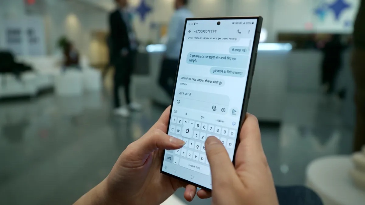 再来是通话即时翻译功能,这功能的英文名叫 AI Translate,就算你用不同语言通话,也能即时让 AI 同声传译并呈现在屏幕上,哪怕对方用的不是三星手机。三星产品管理副总裁 Drew Blackard 浓缩了 AI Translate 的价值,「这就像在通话时拥有自己的私人翻译一样。」