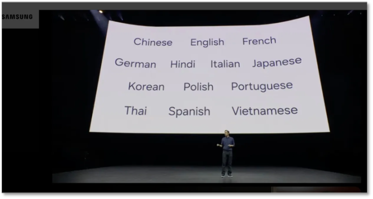 Galaxy AI 支持的实时翻译语言目前包括中文、英语、法语、德语等 13 国语言,音频和文本翻译都在行,未来还会陆续增加其他语系,所有翻译都在设备上进行,主打一个实时,有了这个功能,你出国再也不用考虑该用哪个翻译软件了。