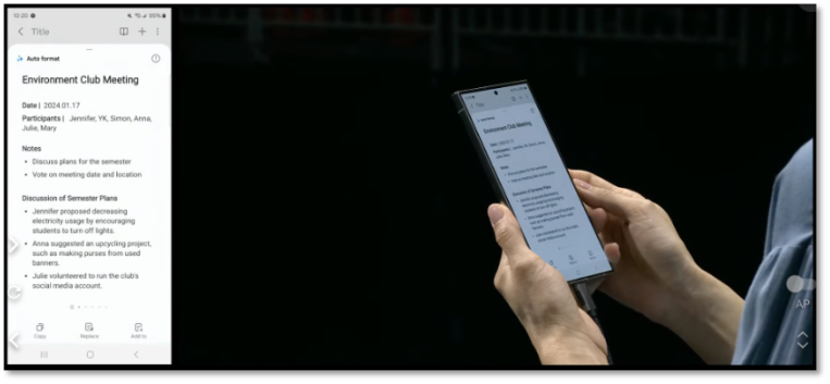 Galaxy S24 以「笔记助手」推出了提要功能,它能自动提取文字中的要点进行翻译或生成摘要,同时,还能帮你整理文件、制作思维导图、提炼标题或进行项目编号,甚至还能够一键转化页面风格,满足个性化的需求。