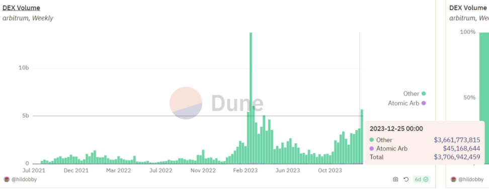 与其他链相比,Arbitrum 上的套利交易比例相对较小。然而,与 Arbitrum 上的三明治交易相比,套利交易的交易量仍然要大得多。