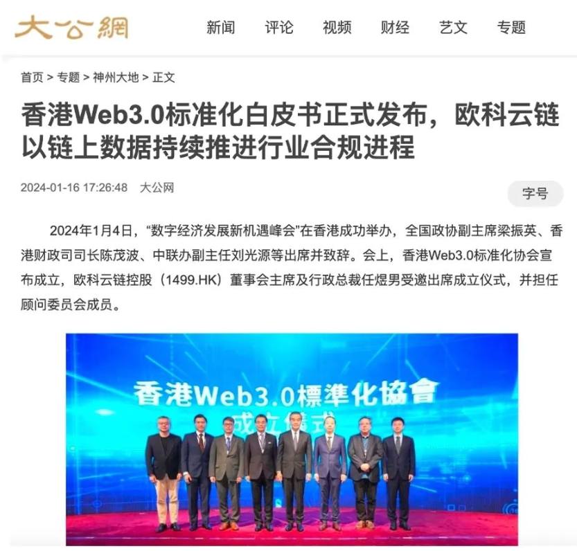 近日,据香港大公报旗下媒体大公网报道,由香港 Web3.0 标准化协会、IEEE 计算机协会区块链和分布式记账标准化委员会等机构发起,欧科云链受邀参编的《香港 Web3.0 标准化白皮书 (2023)》正式发布。这是香港首份关于 Web3.0 标准化的研究报告,不仅有助于香港业界围绕 Web3.0 概念、技术及应用形成普遍共识,还将为未来产业标准化发展提供指导,成为香港发展 Web3.0 的有力支撑。