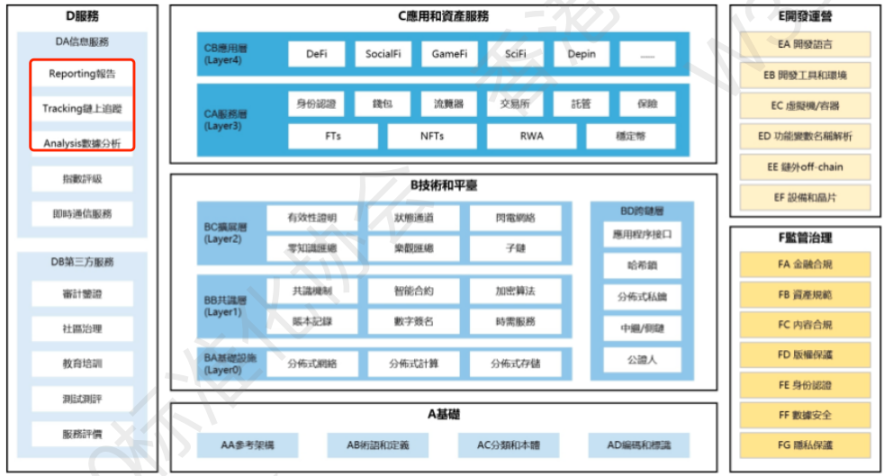 · 完善的Web3.0 标准体系结构包括“A 基础”、“B 技术和平台”、“C 应用和资产服务”、“D 服务”、“E 开发运营”、“F 监管治理”6 个部分。