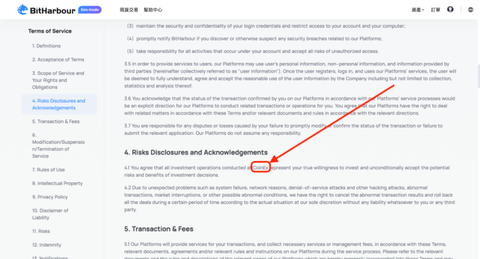 不过,在 BitHarbour 服务协议中,其中一条写明,用户需「同意在 CoinEx 进行的所有投资操作代表真实的投资意愿,并无条件接受投资决策的潜在风险和收益。」推测 BitHarbour 与 CoinEx 之间存在某种业务联系。