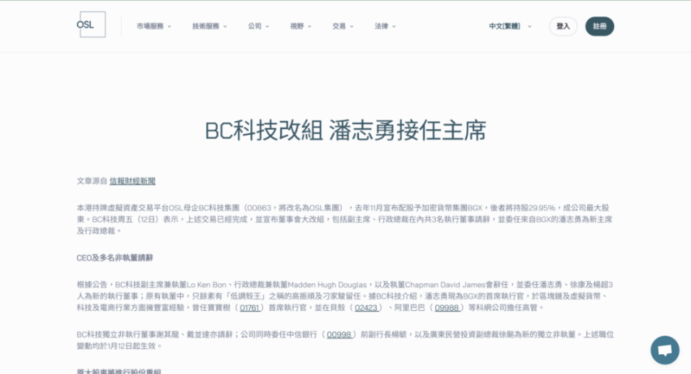 2024 年 1 月 12 日,BGX 与 OSL 交易完成。随后,董事会进行改组,委任现为 BGX 首席执行官的潘志勇成为新主席及行政总裁。