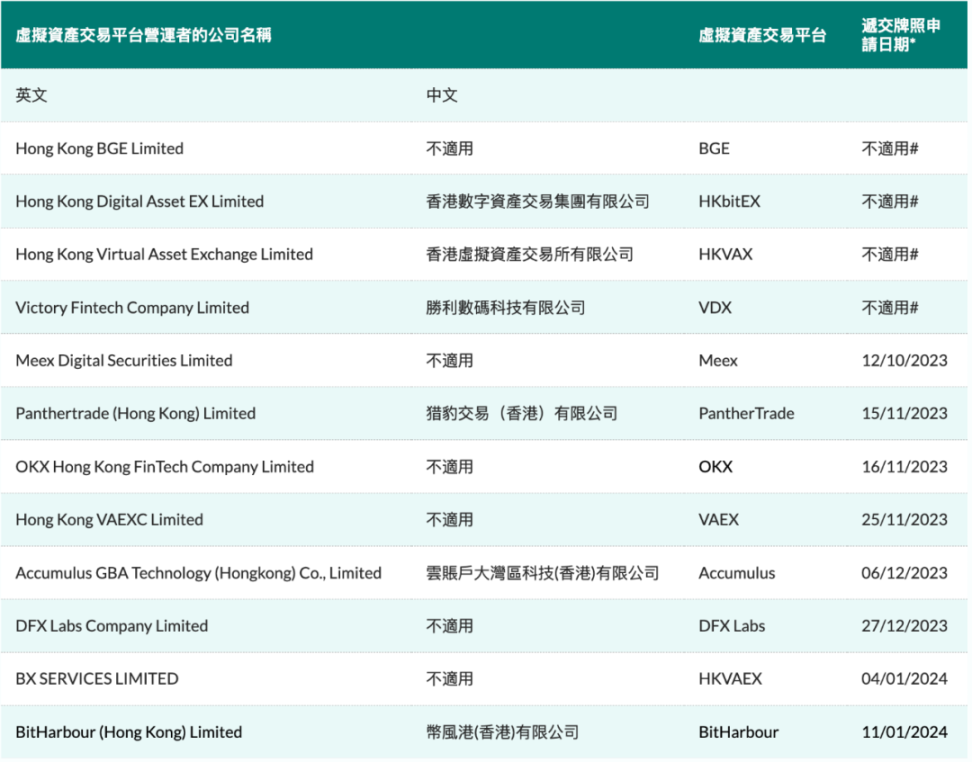 最后一位申请者于 2024 年 1 月 11 日提出申请。BitHarbour (Hong Kong) Limited,中文名币风港(香港)有限公司,交易平台名称 BitHarbour。BitHarbour 同样为目前公开披露信息最少的申请者。