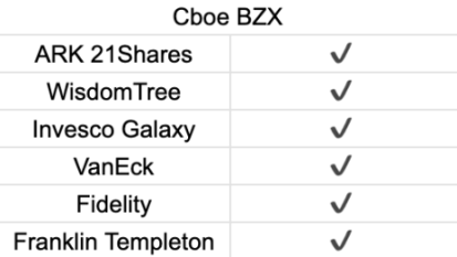 11 个比特币现货 ETF 中,ARK 21Shares、WisdomTree、景顺 /Galaxy、VanEck、富达与富兰克林邓普顿这 6 家选择在芝加哥期权交易所上市。